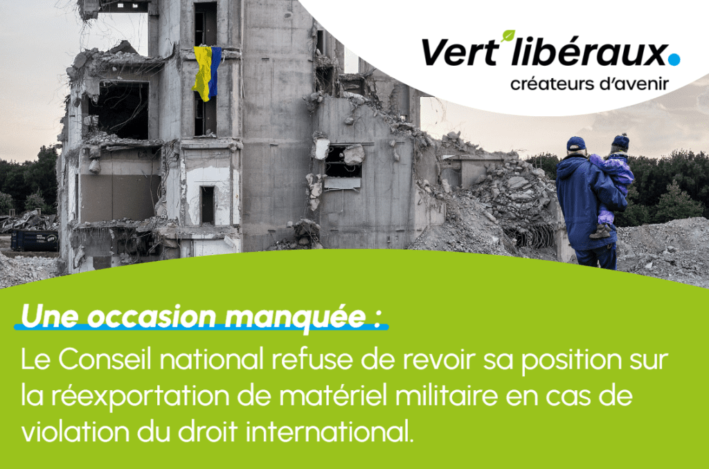 Les Vert’libéraux demandent que soit autorisée par le Conseil fédéral la réexportation de matériel de guerre vers des pays qui se défendent contre une violation du droit international.