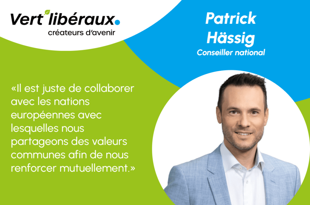 Les Vert’libéraux soutiennent la décision du Conseil fédéral de faire participer la Suisse à deux programmes dans le cadre de la CSP, la Coopération structurée permanente. Il s’agit des projets « Military Mobility » et « Cyber Ranges Federation ». « Cela renforce la sécurité de Suisse », déclare Patrick Hässig, conseiller national PVL.