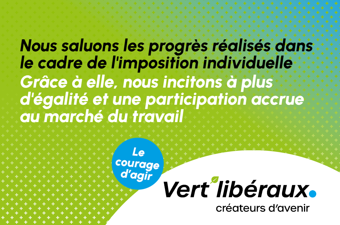 Nous allons évaluer le modèle et, autant que nécessaire, y amener des optimisations en collaboration avec les autres partis favorables à la réforme afin que l’imposition individuelle puisse être introduite dès que possible. Le système d’imposition des couples mariés actuel, par le biais de l’imposition commune, est dépassé. Il est issu d’une image de la famille d’après-guerre et n’est adapté ni à l’égalité hommes-femmes, ni à une imposition neutre sur le plan de l’état civil. De plus, il crée de fortes incitations négatives à l’activité professionnelle pour le deuxième revenu d’un ménage – généralement celui de la femme. Or, la société a grandement évolué, de plus en plus de femmes travaillent, les couples se partagent les temps d’emploi rémunéré et de garde des enfants, et ils ont l’attente légitime que leur travail soit récompensé et qu’ils soient imposés indépendamment de leur état civil.